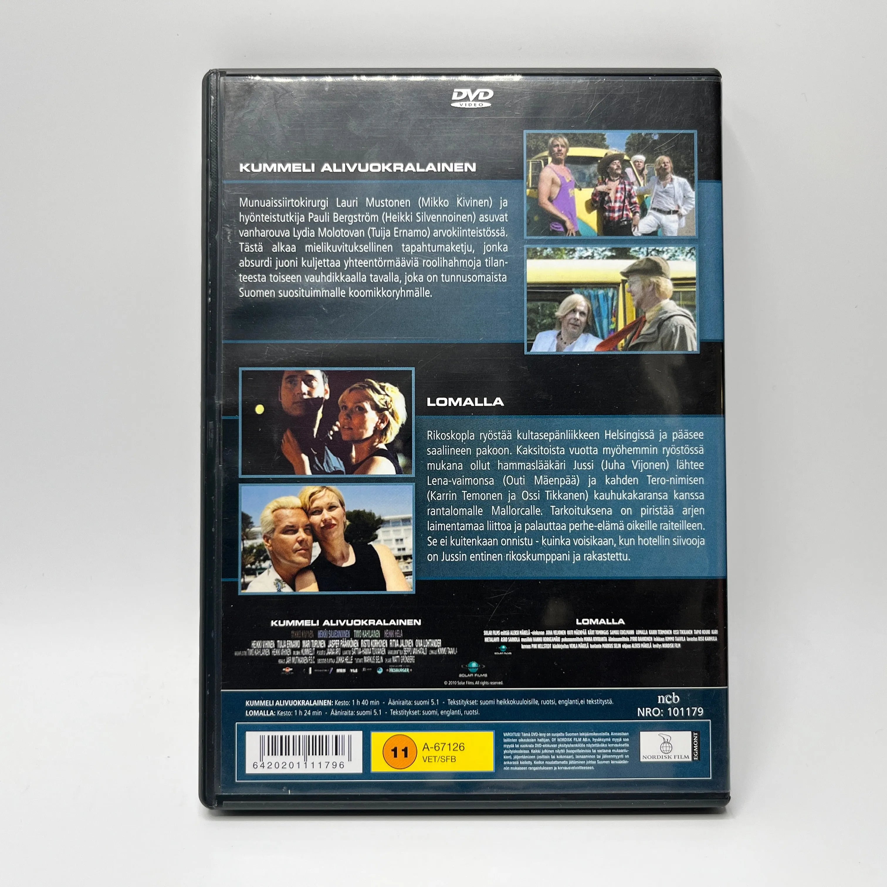 Includes two domestic films: Kummeli - Alivuokralainen (2008), whose wildly absurd plot propels intersecting characters from one situation to another at a brisk pace, and the romantic comedy Lomalla (2000) directed by Aleksi Mäkelä, starring Samuli Edelmann and Juha Veijonen.