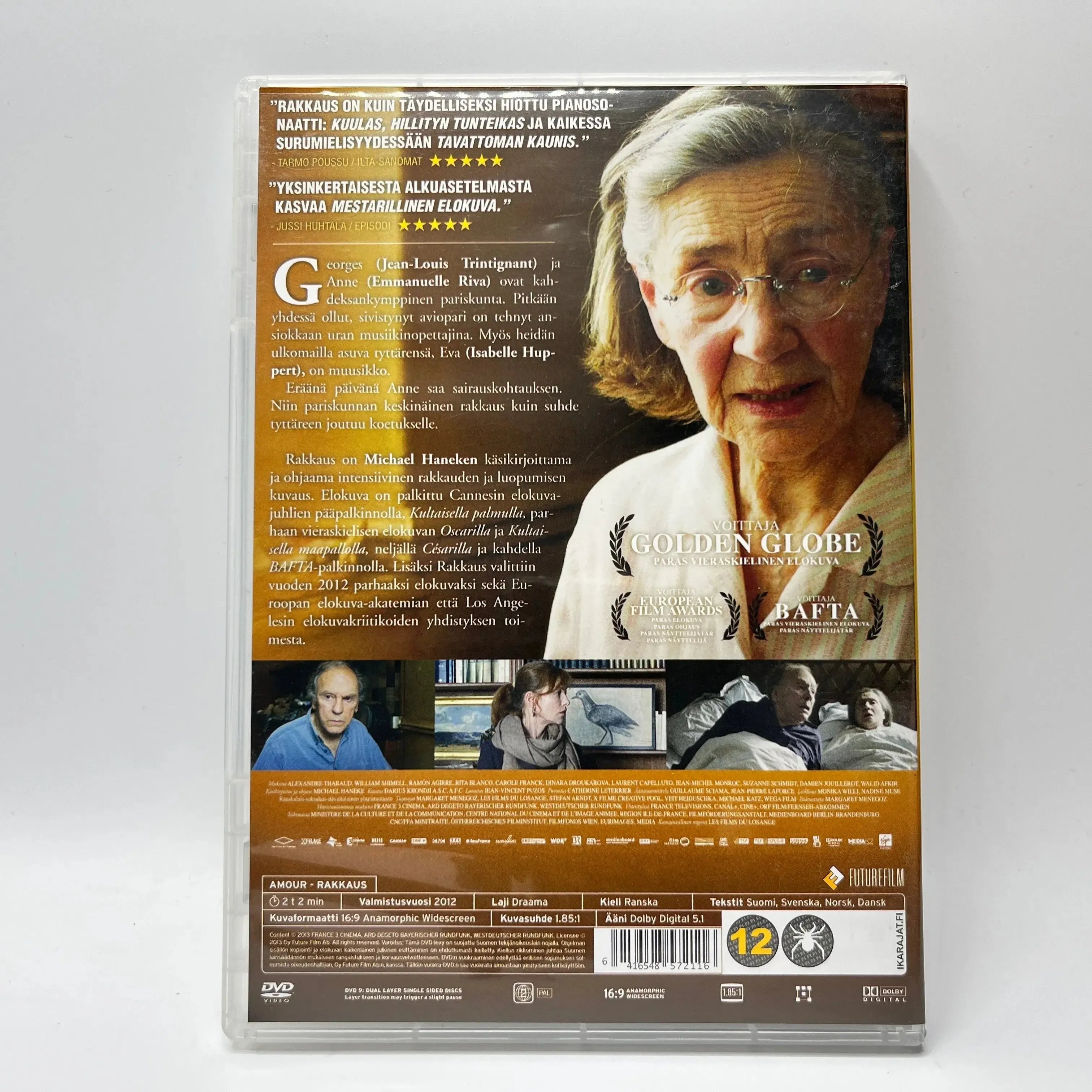 Rakkaus (Amour) on Michael Haneken käsikirjoittama ja ohjaama koskettava draama iäkkäästä avioparista, jonka yhteinen elämä joutuu koetukselle vakavan sairauskohtauksen myötä. Elokuva kuvaa intiimisti rakkautta, uskollisuutta ja luopumisen tuskaa, kun pitkä yhteinen historia kohtaa elämän väistämättömän haurauden. Cannesin Kultaisella palmulla palkittu teos on riipaiseva ja rehellinen tutkielma inhimillisestä arvokkuudesta elämän loppuvaiheissa.