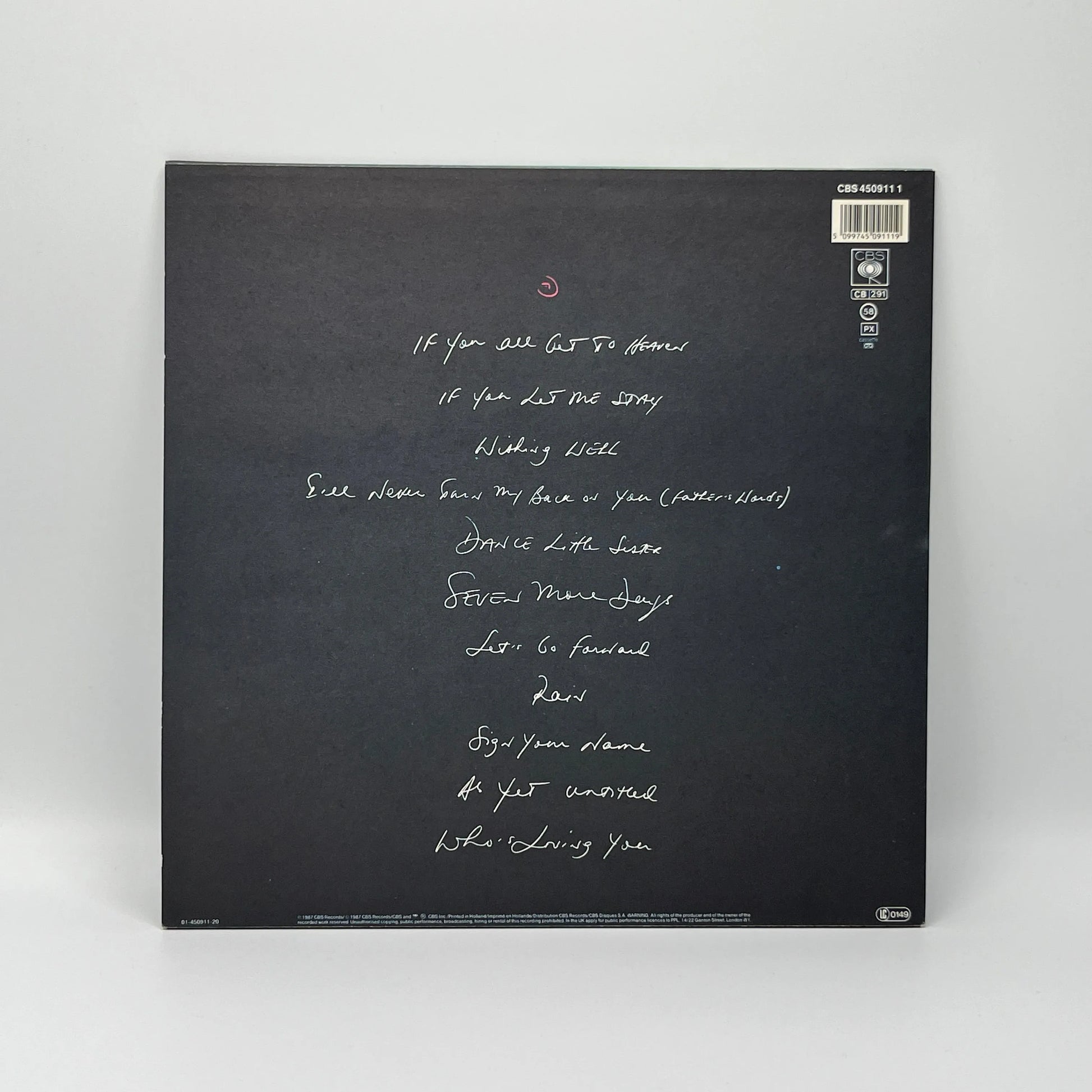 Käytetty LP-levy (1987, UK -painos, OIS, hypetarra, takaviivakoodissa kirjoitusta)